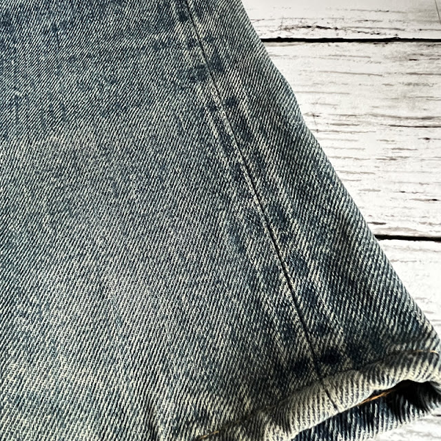 背面の各箇所アタリ具合も非常にいいです。裾はチェーンステッチで上げていてパッカリングも凄い事になっています。ポケット周りやヨークのパッカリングとアタリが凄まじい。ジーンズの色落ちが好きな人は唸る色落ちをしています